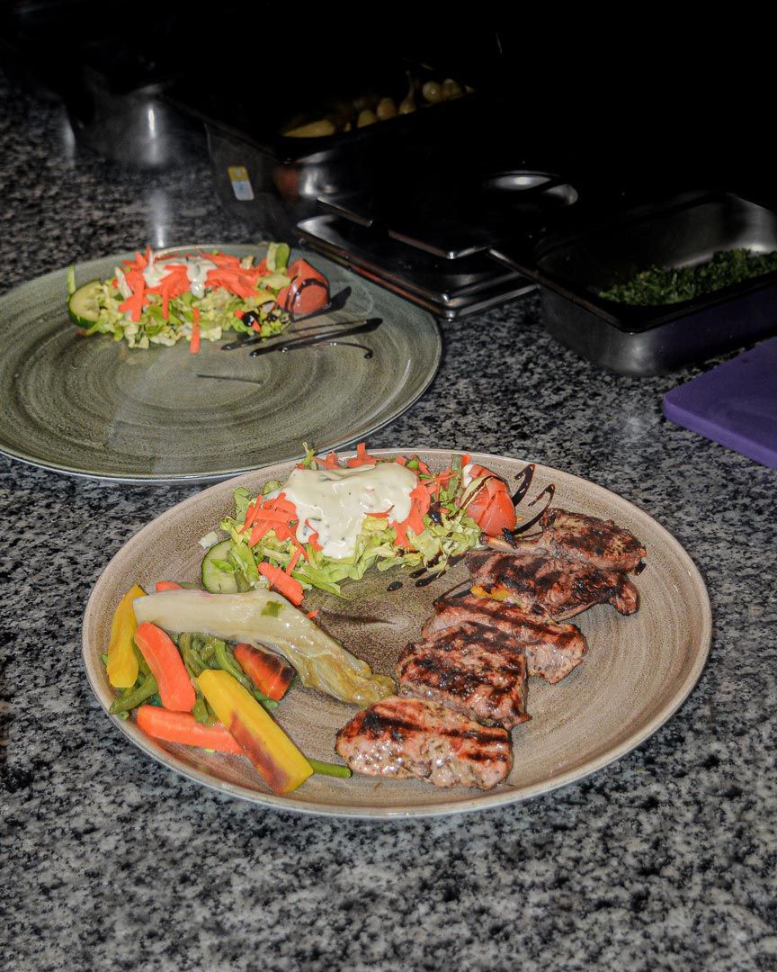 Assortiment de viandes grillées, frites, pâtes, crudités & légumes